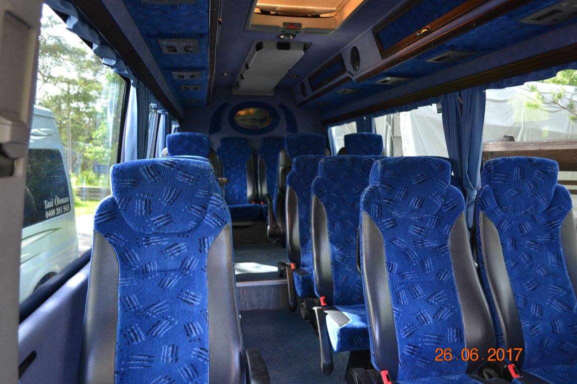 Tilausajot 1+16 henk. linja-autolla myös mahdollisia. Linja-autossa on ilmastointi, tv/dvd-soitin sekä jääkaappi. Linja-auton takaosassa on pöytäpaikka.